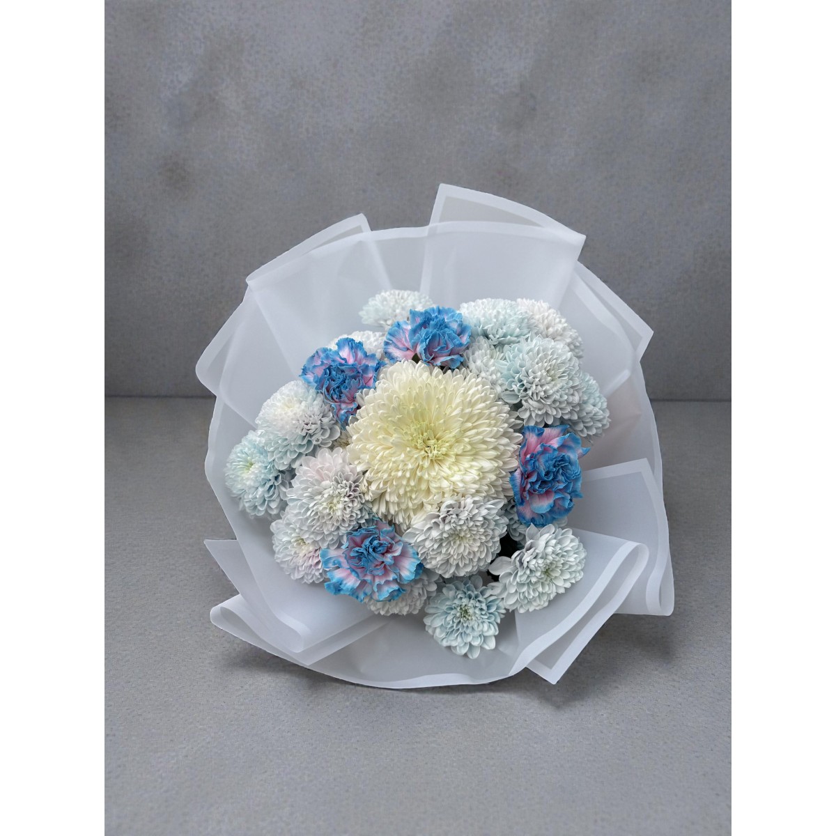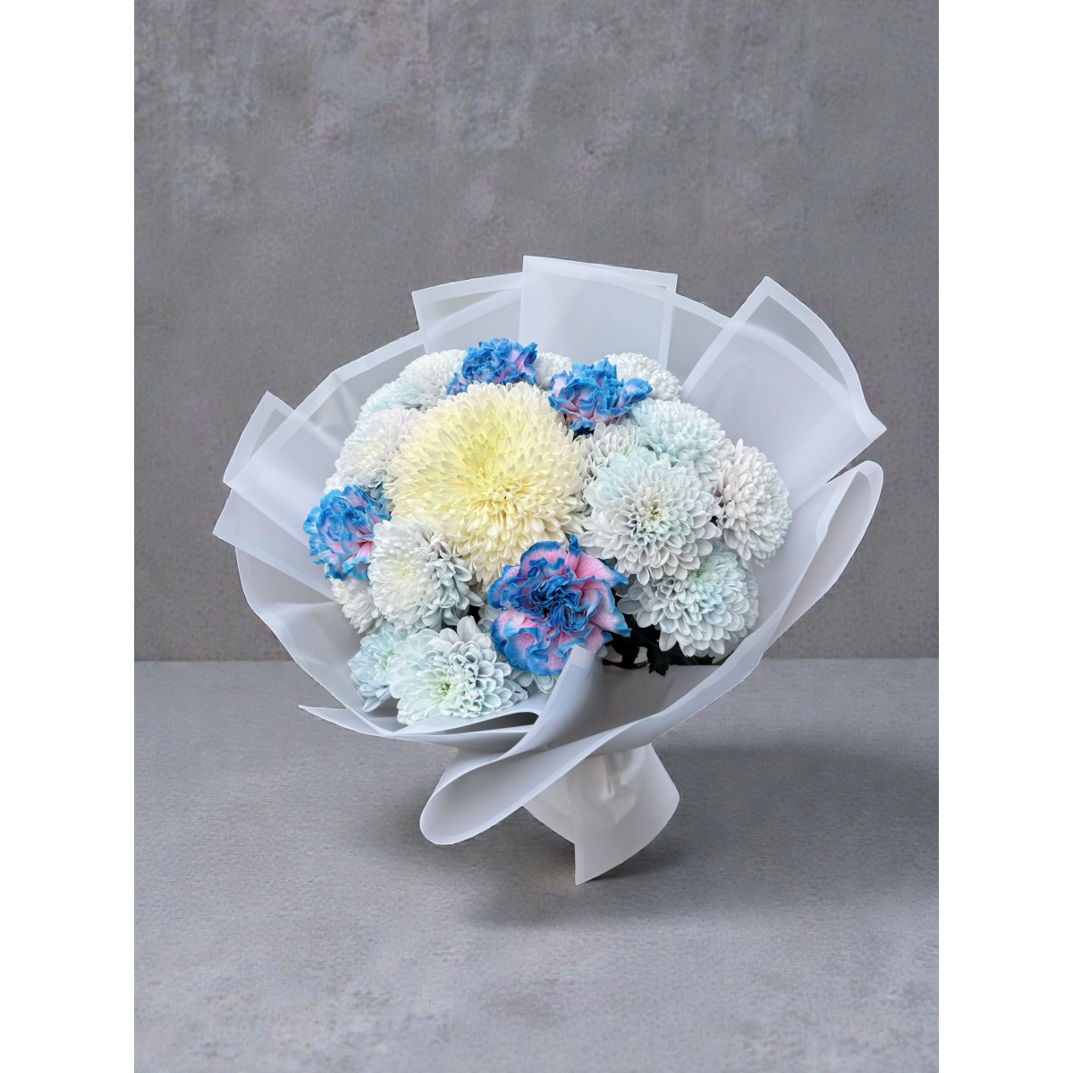 Blue Cloud, bulut gibi yumuşak dokulu beyaz krizantemler ve merkezde konumlanan büyük çiçeğin etrafına yerleştirilen mavi–pembe geçişli özel lalelerle tasarlanmış modern bir premium bukettir. Ekvator, Kenya, Kolombiya ve Hollanda’dan özenle seçilen ithal çiçeklerle siparişe özel hazırlanır; sade ama dikkat çekici görünümüyle yeni doğan bebek kutlamaları, doğum günü, geçmiş olsun ve tebrik için ideal bir tercihtir.
