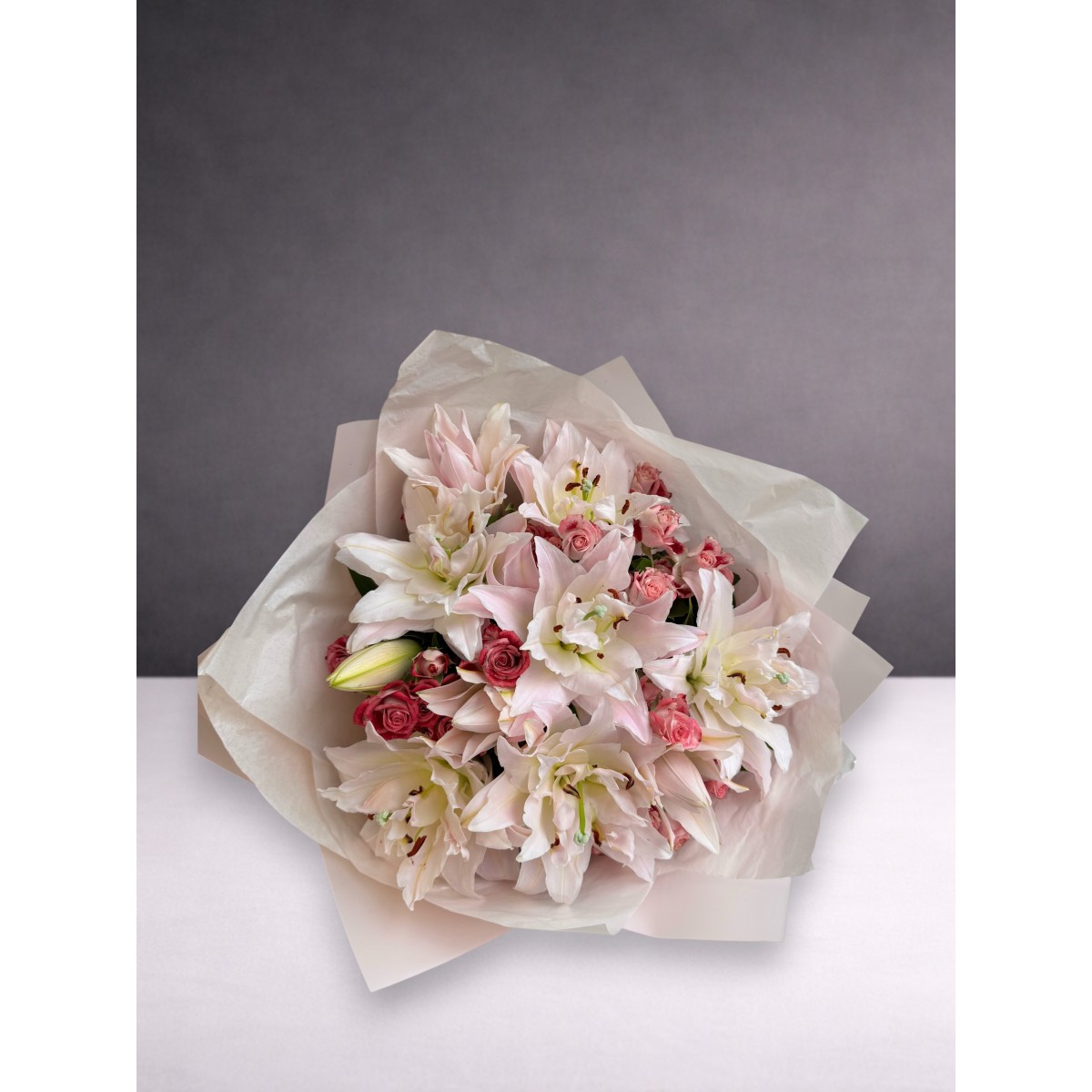 Zarafetin en yumuşak tonlarıyla hazırlanan Blush Lily & Rose Premium Buketi, pudra pembe lilyumların asil duruşunu, seçkin pembe güllerin romantik dokunuşuyla bir araya getirir. Doğallığı bozmayan özel ambalajı ve dengeli tasarımıyla, ilk bakışta kalite ve özen hissi uyandırır.