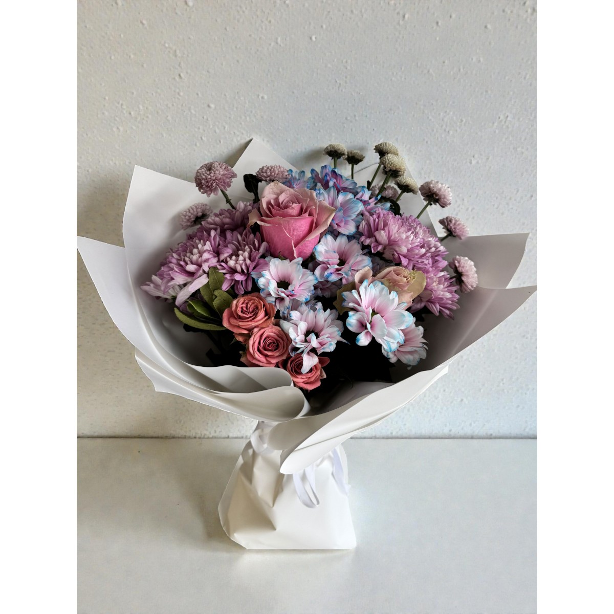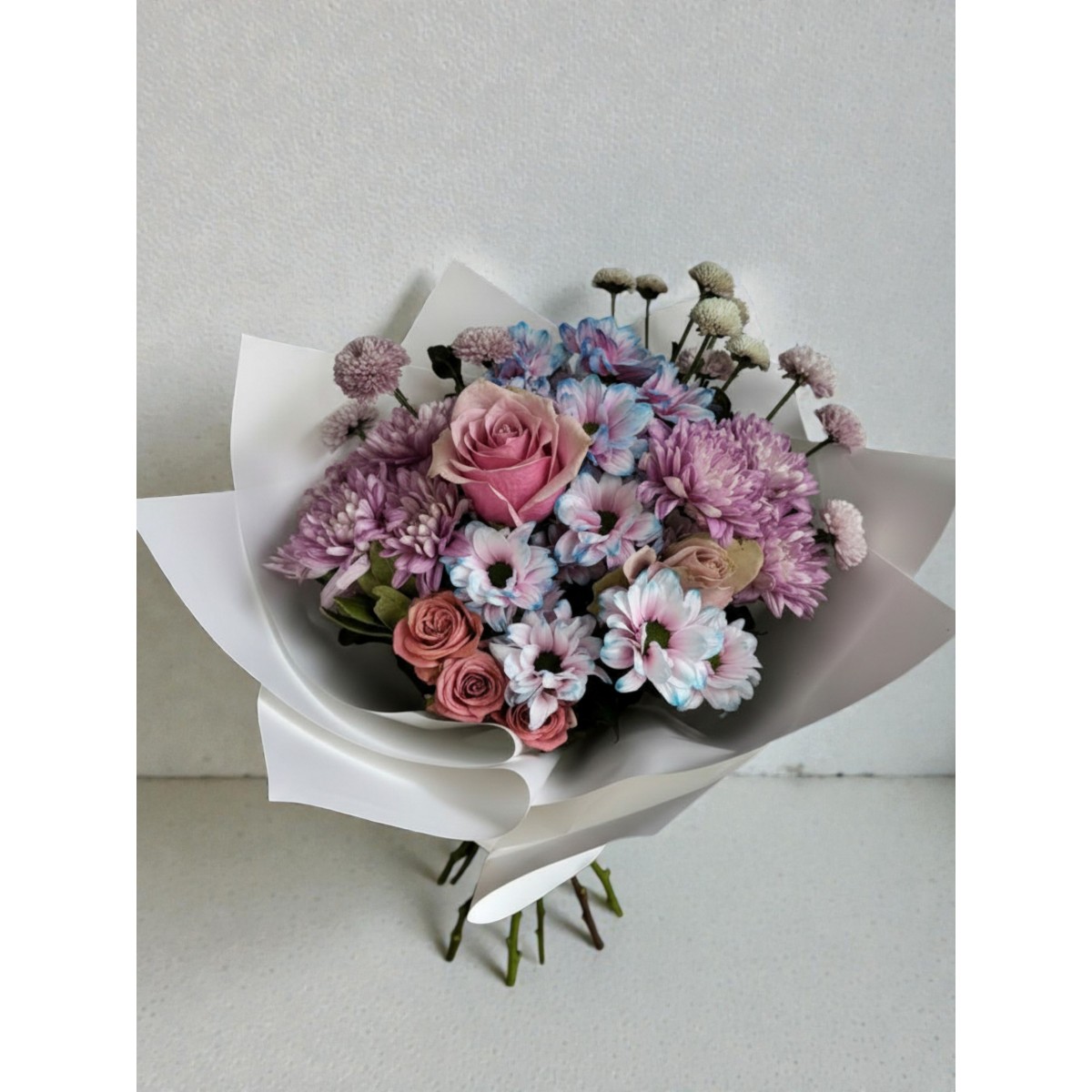 Kullanılan çiçekler: Pembe gül, lila ve pudra krizantem, renk geçişli papatya, mini güller, yeşillikler.